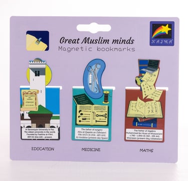 Great Muslim Minds magnetic bookmarks each tells a different story of one the great Muslim pioneers or places. Designed to inspire and bring awareness of Muslim contributions to the world. These bookmarks are beautiful and practical too. They are magnetic so hold securely to your page. Gone are the days where the bookmark slips out from the book or is lost within the pages.